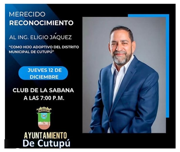 En nombre de toda la comunidad de Río Verde Arriba, Villa Cutupú, y nuestro director Robert Donald Tolentino Grullón, según la resolución No. 10-2024, de esta Junta Municipal, es un honor otorgar el reconocimiento al ingeniero Eligio Jáquez como Hijo Adoptivo de nuestro querido pueblo. Esta distinción no solo refleja nuestro profundo agradecimiento, sino también el valor incalculable de su contribución al desarrollo de nuestra comunidad.